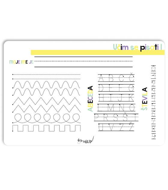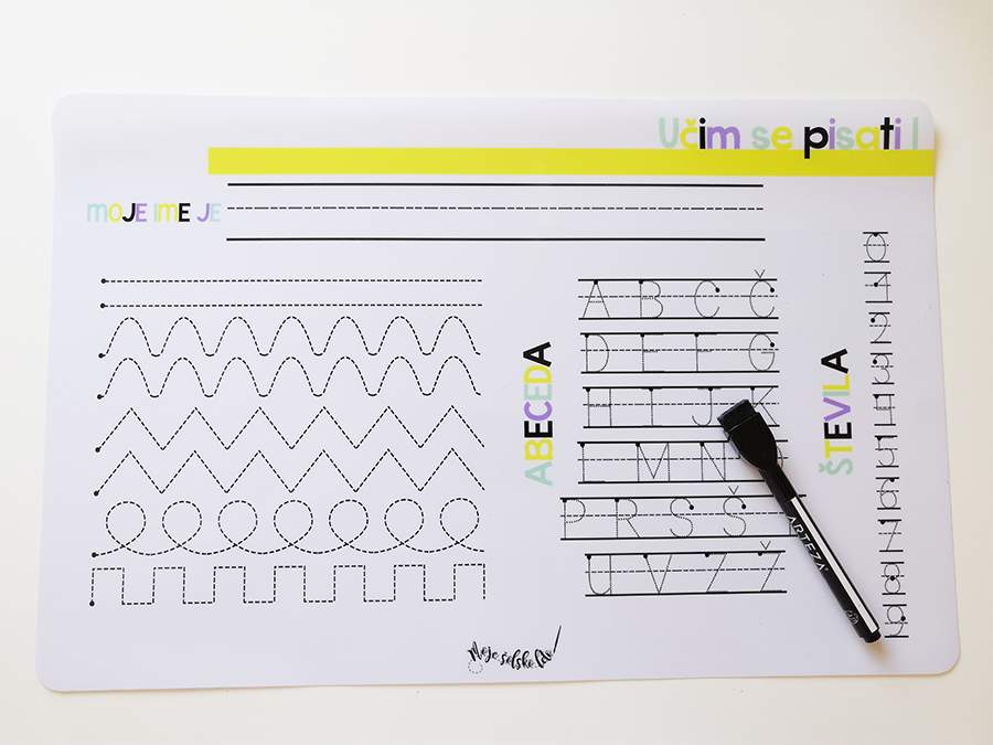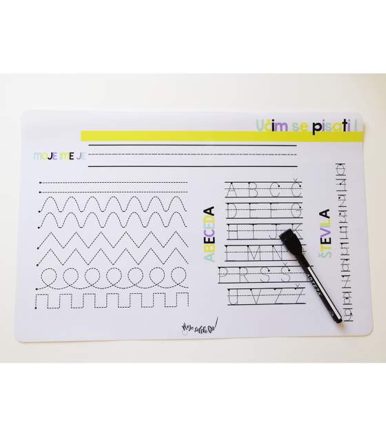 Izobraževalna biši briši podloga Moje šolosko leto je podloga na katero se lahko piše in briše. Na njej se vadi pisati črke in števila, prav tako je tudi zaščita, da se miza med hranjenjem ne umaže. Velikost podloge je 28x43 cm. Cena za 1 kom.