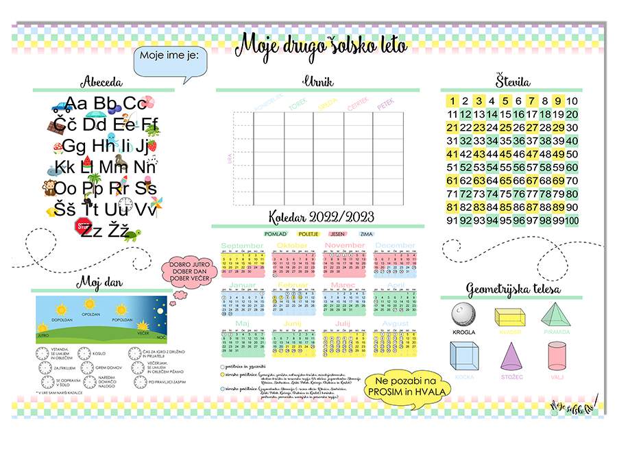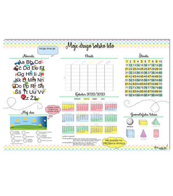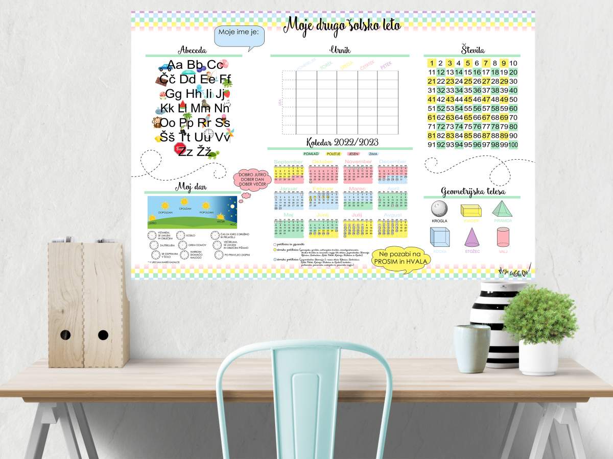 Čudovit izobraževalni plakat za drugošolce, z abecedo, števili do 100, dnevom in uro, geometrijskimi telesi, urnikom in koledarjem z označenimi počitnicami ter letnimi časi...vse s čemer se bodo šolarčki seznanili v svojem drugem letu OŠ.