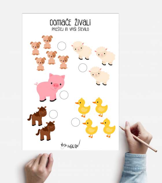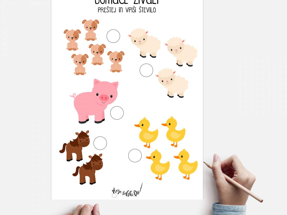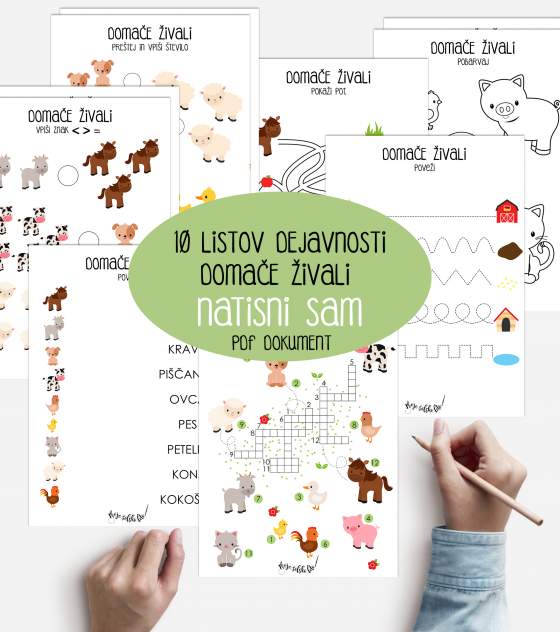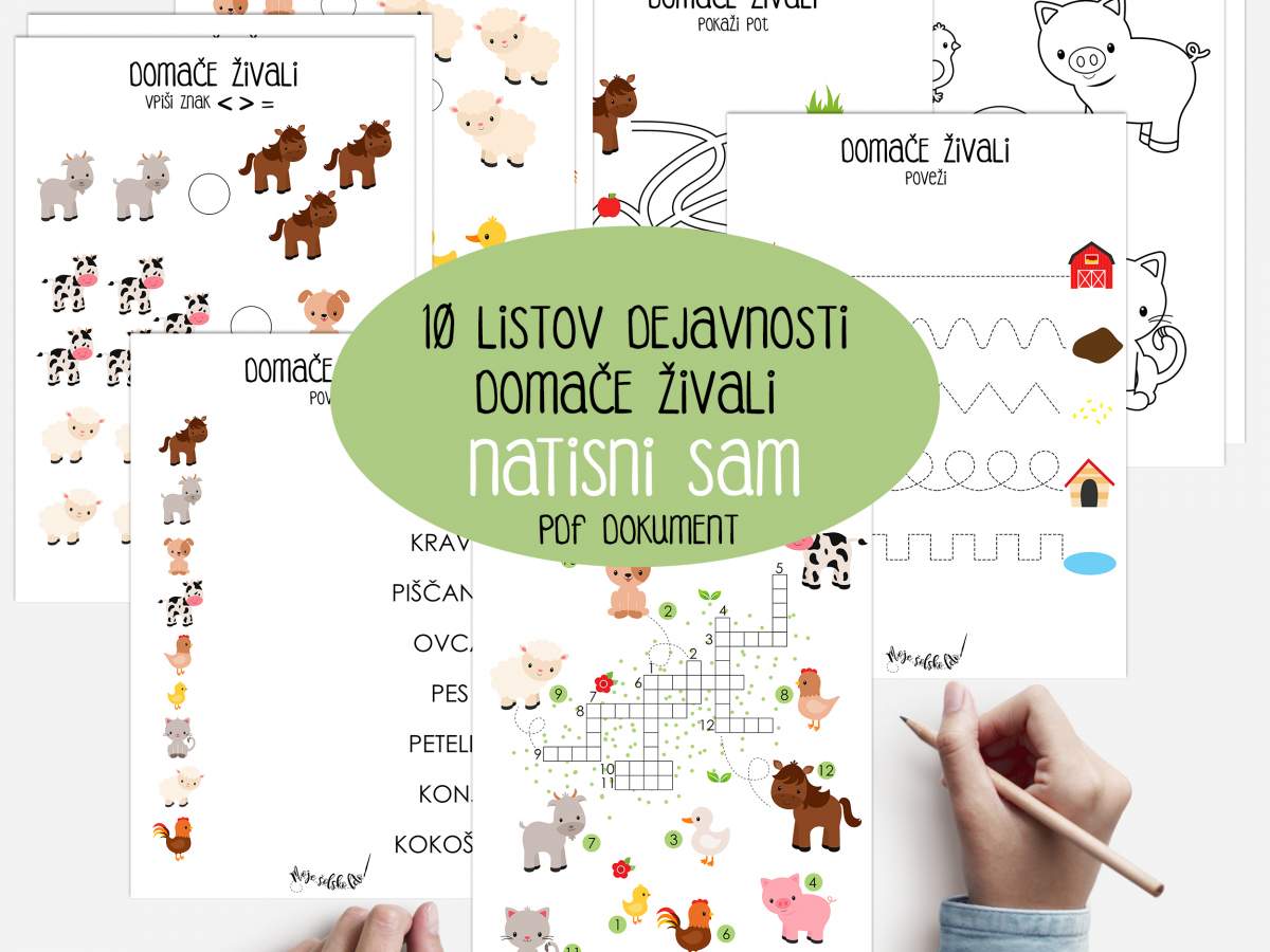 Dokument vsebuje 10 A4 listov (križanka, štetje, barvanje, povezovanje...) na temo domačih živali.