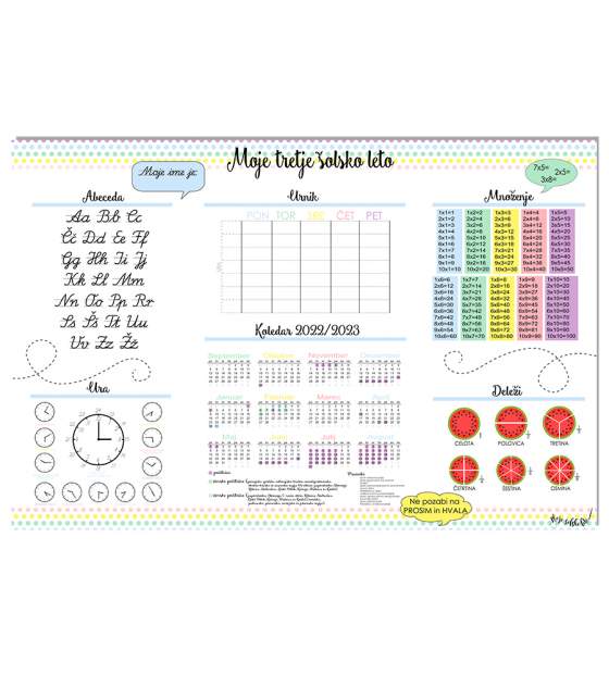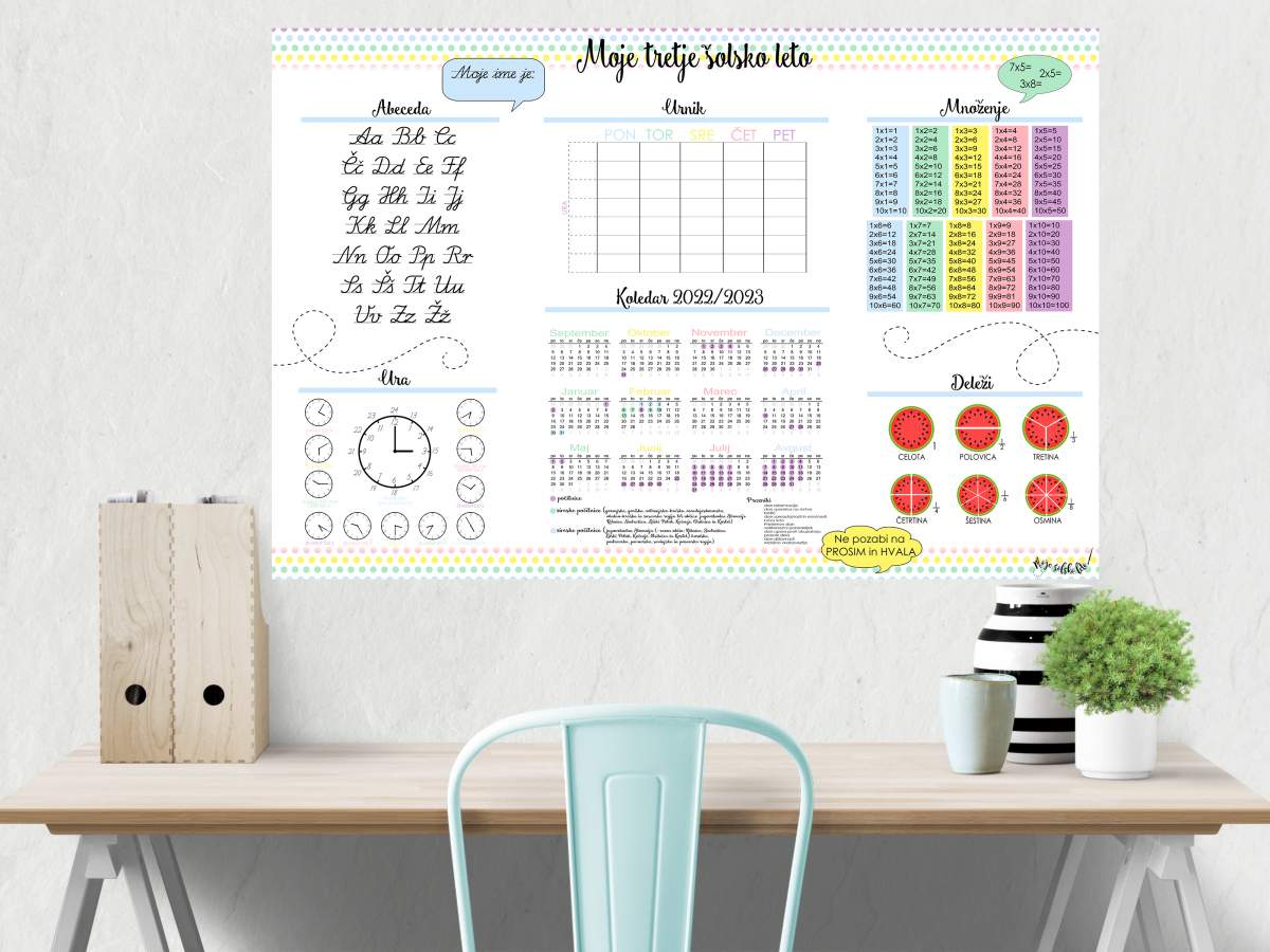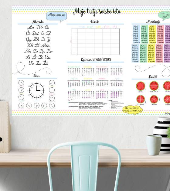 Čudovit izobraževalni plakat za tretješolce, z abecedo, množenjem, uro, deleži, urnikom in koledarjem z označenimi počitnicami ter prazniki...vse s čemer se bodo šolarčki seznanili v svojem tretjem letu OŠ.