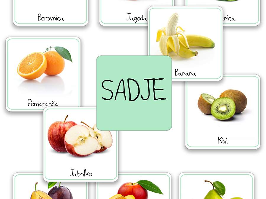 Kartice so zasnovane kot pripomoček za bogatenje besednega zaklada, za učenje branja in pisanja ter za igro. V kompletu SADJE je 10 kartic (+naslovna).