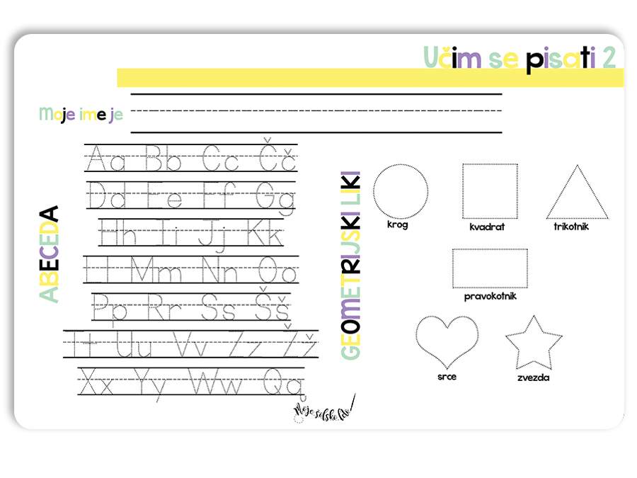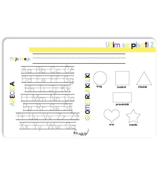 Na njej se vadi pisati velike in male tiskane črke ter like, prav tako je tudi zaščita, da se miza med hranjenjem ne umaže.
